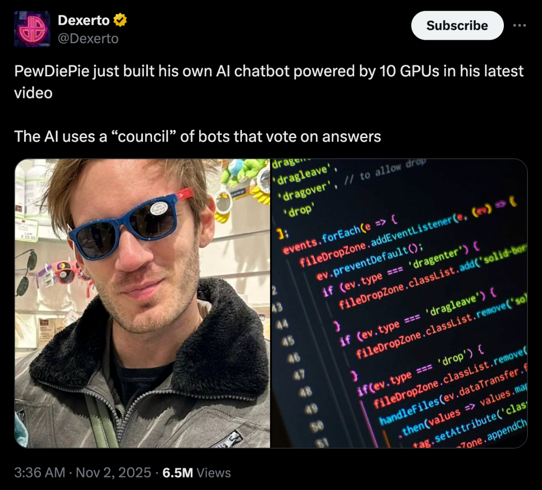 要知道 PewDiePie 是笔记本都海外游戏博主顶流中的顶流,Youtube 粉丝超 1.1 亿,欧交易所appIns 粉丝 2 千万。他下场部署本地 AI 引起全网巨大轰动。