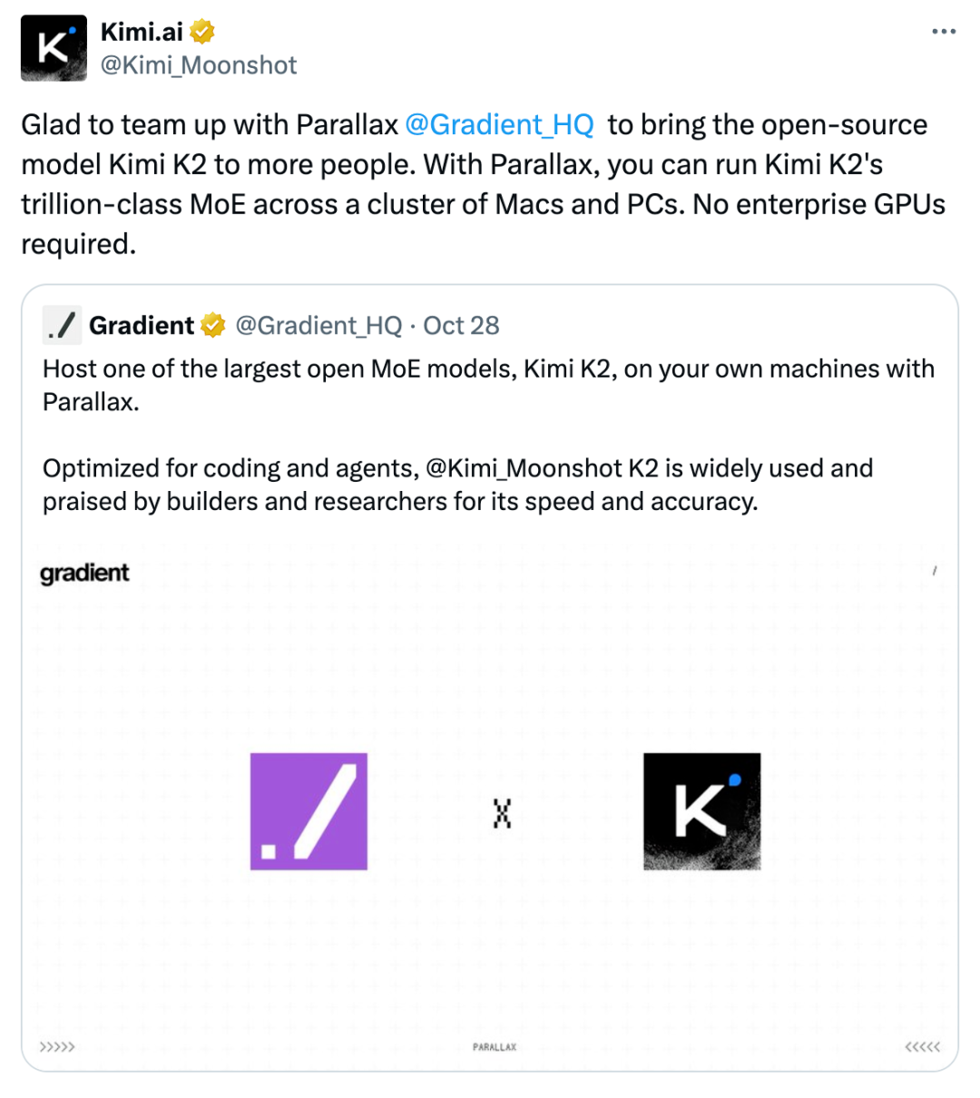 宣布开源后,Parallax 团队也在持续更新,支持了包括 Kimi K2 Thinking 等最近一些广受欢迎的大模型。希望早日看到他们对多模态模型的支持,这将进一步提升本地 AI 的想象空间。