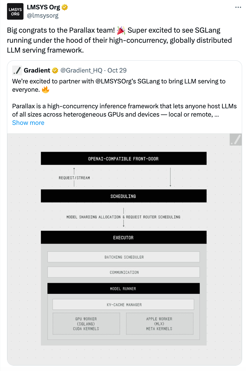 大家可能已经熟知 LMStudio、Ollama、Exo 等本地 AI 项目。而近期,一个叫 Parallax 的开源 AI 项目又频频出现在开源 AI 行业朋友圈中。阿里千问、Kimi、智谱 Z.ai、MiniMax、SGLang/LMSys 通通转发打 call 。